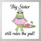 Storsisterkartonger, plattor, prydnadsföremål, anteckningsböcker, dekorativ kudde, gelmunssaxar, porträtt, klistermärken och andra stora systerkläder och presentartiklar som innehåller en flickgroda och liljepad och text med texten "Big Sister still regler the pad!". Underbara syskon ger till det äldre syrran när nyfödd bebis bror eller baby syster kommer!