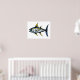 en dekorativ teckning av en stor tonfiskfisk med gult och blå färgad som simmar längs med. En underbar utformning för fläkt av skaldjur och fiske.