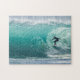 Colorful puzzle features photography of surfer surfing inside large Hawaiian Pipe wave.