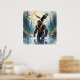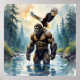 Bigfoot poster. En muskulär Sasquatch med en örn som landar på axeln medan han vajar genom en flod i en skog.