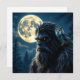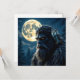 Bigfoot-kort. En Sasquatch med gyllene glödande ögon med uggla på axeln med full månskog i blå nyans.