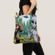Totebag har humor-teckningar av Sasquatch-grått-främmande i skogen. De är båda förvånade över att se varandra! Komedic illustration har också en UFO i bakgrunden.