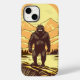 Retro Bigfoot eller Sasquatch som står på sten framför gräs träd och ett berg solnedgång. Utfärdad i vintage färg orange, gult och brun.