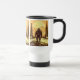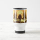 Retro Bigfoot eller Sasquatch som står på sten framför gräs träd och ett berg solnedgång. Utfärdad i vintage färg orange, gult och brun.