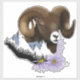 A portrait of a Ram / Bighorn Sheep with mountains and flowers.