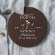 Lägg till en chic touch för cocktailparty till dina möhippe-outfits med denna personliga "Bikinis & Martinis"-knapp. Inspirerad av Palm Springs-glamour har denna eleganta design raffinerad typografi, palmer och martini-illustrationer på en rik kakaobrun bakgrund - perfekt för moderna brudar och destinationsevenemang.