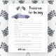 Kort för inbjudan till babydusch för biltemat i tävling med vattenfärgade illustrationer av lila (violett) vintage bil och svart - vitt tävling flagga. "Tävling på för en babydusch."