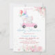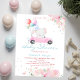 Unik inbjudan till varje flicka att duscha barn med vattenfärgen rosa vintage bil med ballonger och blommor.