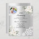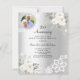För en elegant och romantisk 25:e bröllop-årsdag. En faux silver tittar bakgrund som dekoreras med vita blommigtar, ro och vita snöre. Anpassa och lägg till foto, namn och information. 1 lakan = 1 inbjudan tryckt kant till kant.