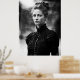 Ett svart och vitt foto som simulerar ett foto av en nödlidande vintage från en 1800-talslärare som bär en svart klänning med silver-knappar. Skapad med generativa algoritmer och Photoshop.