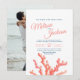 Söt vattenfärgskonst och dina egna fotobröllopsinbjudningar. Vackra bröllopsinbjudningar är idealiska för strand, hav eller koralltemat bröllop. Anpassa med egna detaljer och foton på motsatt sida. Andra matchande artiklar är också tillgängliga. © Original under sea coral vattencolor målart and design by Sarah Trett for www.mylittleedenweddings.com