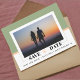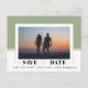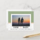 Skicka fotovykort för grönt och persiko-blockera bröllop spara datum-färg. Den övre delen av Spara datumsymbolen är i sidled grönt färg färg med persikor rand medan grund är vitt med texten. Det innehåller också ett foto av paret.