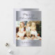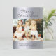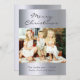Ett modernt julfotokort. Anpassa och lägg till ditt familjefoto för semesterhälsningarna. God jul i mörk grått med ett modernt handskript i stil. Mall för din familj namn på framsidan. En faux silver metallisk tittar bakgrund. Enkel och elegant.
