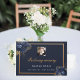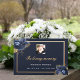 En gäst bok för en minnesstund eller begravning. En mörk blått bakgrund med blå blommigtar och en faux guld ram på framsidan. Anpassa och lägg till ett foto, namn och data.