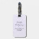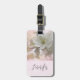 Ett bagagemärke med ett foto av ett äpple träd gren som visar sina vackra vita äppelblommar.
