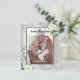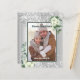Faux silver tittar bakgrund, dekorerad med vita blommigtar, blommor, eukalyptus grenery och faux silver glitter, gnistor. Anpassa och lägg till information om foto, namn och bröllop.