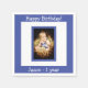 En blå och vit fotonapkin för en pojkes första födelsedag party. En blå ram och vit bakgrund. Blåfärgad brev och texten: Grattis på födelsedagen! En mall för Ditt foto av födelsedagsbarn, namn och ålder.