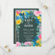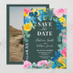 Rustiskt svart blommigt av färgtavla med chic fet sommarfoto bröllop spara datum med målat blått, gult vild fält solblommor, rosa ros, sage grönt eucalyptus på redigerbar mörk för grönt. Perfekt till sommaren, rustik lada utomhus bröllop.