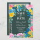 Rustiskt svart blommigt av färgtavla med chic fet sommarfoto bröllop spara datum med målat blått, gult vild fält solblommor, rosa ros, sage grönt eucalyptus på redigerbar mörk för grönt. Perfekt till sommaren, rustik lada utomhus bröllop.