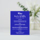 Royalets blå bakgrund. Vit text. Framsida: Anpassa och lägg till ditt namn, datum och menyn. Tillbaka: Lägg till egna foto- och roligt-fakta om födelsedagskalkylen. Ta bort namn om det inte behövs. 1 lakan = 1 meny utskriven kant till kant.