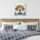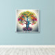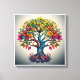 Bilden skildrar ett dynamiskt och färgstarkt träd med tjocka, texturerade segment och invecklade rötter. Träd är förfärat med en mängd löv i olika nyanser av grönt, gult, orange och rött, vilket tyder på att årstiderna förändras. Det övergripande intrycket är tillväxt, livskraft och naturens sammanlänkning.