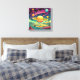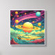 Den här surrealistiska bilden ger en fantastisk och livfull extern scen. En stor, orange- och gult-ringad planet står i centrum och är avstängd ovanför ett stillastående sjö som spegel ligger vid färg i himmel. Värmen är en rolig galaxi av ljusa stjärnor, nebulae och många andra planeter och måne i olika skuggor av orange, gult, blått och grönt. Landskapet nedanför är lika fantasifullt, med rullande backe och märkliga formationer som återges i en fantastisk palett med blues, pinks och gröntar. Vatten yta återspeglar de levande himmel och kosmiska föremålen och skapar en harmonisk och drömmande sammansättning. Hela stil är viskartat och på annat sätt blandar kosmisk skönhet med ett främmande landskap.