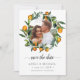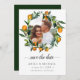 Elegant Citrus botanical sparar datumet ett favoritfoto av förlovning omgivet av en rund krans av pulant grenar av mandarincitrusfrukter och klementin, elfenbensfoto och löv, "spara datumet" i kalligrafi-skriptbokstäver, med namn, bröllop datum och plats under i klassisk blommar-serif-typ. Vibranta blad av grönt bladverk, orange av ljus tangeriner och mjuka vita blommor för detta färska och harmoniska färg-program. Baksidan har en djup grönt. Perfekten för Medelhavet inspirerade bröllop, det sicilianska temat bröllop och boho botaniska bröllop hela året runt. Dessa utformningar kan vara personlig för ditt särskilda tillfälle och skulle vara perfekt för bröllop, möhippa, förlovningsfest, födelsedagsfest och många fler särskilda tillfällen. *** För begäran om anpassningsbar, skriva ett e-postmeddelande på citronelladesign@gmail.com.