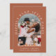 Elegant terrakotta bröllop eller privat bröllopsinbjudan och mottagningsinbjudan. Framsidan visar din bild i en arkram och "Lyckliga för alltid-fest" i elegant vit typografi. Lägg till dina förnamn, bröllopsdatum och plats. På baksidan kan du anpassa ditt meddelande och lägga till dina namn i ett signaturliknande manus.