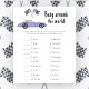 Kort för inbjudan till babydusch för biltemat i tävling med vattenfärgade illustrationer av lila (violett) vintage bil och svart - vitt tävling flagga. "Tävling på för en babydusch."