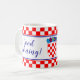 Den här marinblå kombinationen mugg har en kroatisk hälsning "Dobro jutro!" på ena sidan och den engelska versionen "Bra morgon!" på andra sidan. Det finns två rader med röda och vita checkers samt tunt rött, vitt och blått rand överst och grund i det kontrollerade mönster. Texten är anpassade och det blå kalligrafteckensnittet matchar färg i det kroatiska flagga. I mitten jackar arm (grb på kroatiska). Underbar presentidé för tvåspråkiga kroater.