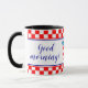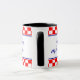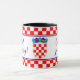 Den här marinblå kombinationen mugg har en kroatisk hälsning "Dobro jutro!" på ena sidan och den engelska versionen "Bra morgon!" på andra sidan. Det finns två rader med röda och vita checkers samt tunt rött, vitt och blått rand överst och grund i det kontrollerade mönster. Texten är anpassade och det blå kalligrafteckensnittet matchar färg i det kroatiska flagga. I mitten jackar arm (grb på kroatiska). Underbar presentidé för tvåspråkiga kroater.