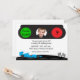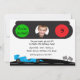 En rolig födelsedagsinbjudan med tema racerbil. Designen har ett trafikljus med en ruta för ett foto och en ljusblå tävlingsbil på vägen med rutor flaggor. Lätt att anpassa med detaljer om din händelse. Inbjudningar levereras med vita kuvert och ditt val av papper. vissa grafik ©Riefka Designs