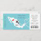 En rolig men stilfull bröllopinbjudan i ett logi passerar/biljettstil för par gifta sig utomlands i Mexico som visas i en vitkartasilhouette på bleka krickablått med söta röda kärlekhjärtor, flygplansilhouette, och vitpärlor som virvlar runt in i en hjärta, formar. Det omvänt har ett utrymme för ditt foto, och contact/RSVP specificerar