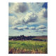 Den häpnadsväckande landskapsbilden visar en levande grönt, avlägset backe och dramatiska moln över huvudet. Det fredliga landskapet framkallar lugn och skönhet i naturen på landsbygden.