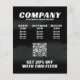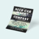 Biltvättstäckning med dynamisk bild av vattenvåg och lyxbil. Inkluderar prislista, kampanjrabatter och QR-kodutrymme.