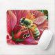 En utförlig bild som visar en bin som samlar pollen från en ljus hibiscus-blomma i rosan, med betoning på ekologiska relationer och naturskönhet.