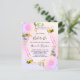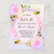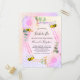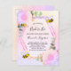 Elegant, roligt, rustik sommar inbjudningskort för möhippan. En bakgrund för regnbåge i rosa, lila och gyllene med en bikaka i mönster. Ett geometriskt ram. Dekorerad med blommor och eukalyptus greenery och lycklig humla. Med texten: Bride to Bee och namn i bruden på framsidan skriven med ett modernt handskript skrivet stil. Black brev. Tillbaka: Tips om honeycomb mönster: Om du inte vill att det ska se ut som ett vykort klickar du på anpassa, går bakåt och tar bort delaren och efter frimärke.