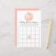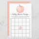 Bingo-spel för spädbarn i gender-neutralt med texten "babydusch bingo" i ett grått-skript i snyggt med svascher och en orange pumpfärgning i vattenfärg.