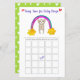 En söt, lekfull bild av en söt, kawaii, slarv som hänger på en färgstark, boho-regnbåge med lila och grått-handskriven typografi hedrar mamma/det par som ska bli. Ett vackert vitt hjärta, mönster, som täcker grönten i vår ligger på baksidan. Fira din könsneutrala babydusch med den här roligten bingo-spelet! Fyll varje ruta med presentartiklar som du tänkor mamma/det par som ska tas emot. När varje gåva öppnas markerar du rutan på kortet. Den första som får fem i rad är vinnaren! Matchande inbjudan, blöjor, tallrikar, klistermärken och andra duschgodis finns också i denna speciella samling och i denna samling av roligtar. Garanterad att lägga till extra roligt vid speciella firande! Om du vill kan du göra eventuella kopieringsändringar med de lättåtkomliga mallarna för använda och du kan enkelt anpassa det här babyduschbingospelkortet. Var snäll och meddela mig med eventuella frågor eller förfrågningar.