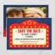 Ett mycket roligt meddelande om att spara datumet som presenterar en biografteater med den blivande brudens och den blivande brudgummens namn som stjärnor i sin egen film. På baksidan av meddelandet finns en filmduk med silhuetter av människor som sitter i publiken, lägg till era förlovningsfoton på duken så att ni kan vara stjärnan i er egen film. Filmnamnet kan ändras till vad som helst eftersom kortet är helt anpassningsbart.