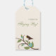 Bird birthday collection featuring a brown bird on a tree branch amidst leaves and bright blue flowers