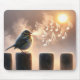 Cute bird sjunger med musik noter i mistmorgon solsken