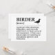 A clean typographic layout featuring the definition of birder. For bird lovers and nature observers who record wild birds in their habitat with binoculars or cameras. Ideal for birding, wildlife fans, and outdoor enthusiasts.