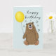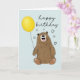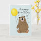 This is a birthday card with a smiling bear sitting down holding a yellow balloon. The background is a light gray blue and the text, ‘happy birthday.’