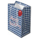 Blått och vitt gingham-check mönster med Grattis på födelsedagen text och röd ballong storleka på gingham mönster kan ökas eller minskas.
