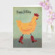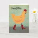 This delightful birthday card features a striking yellow chicken strutting down a sidewalk, elegantly wearing red cowboy boots. The card’s text simply says, “Happy Birthday.”