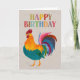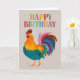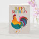 This delightful birthday card features a colorful rooster with fluffy, textured tail feathers. The background is a watercolor grunge cream, and the text in bold, bright patterned letters reads, “Happy Birthday.”