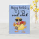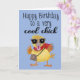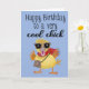 This is a cute birthday card showing a yellow chick with leopard print purse and sunglasses and wearing a red scarf around the neck. The text is Happy Birthday to a very cool chick all on a periwinkle blue background.