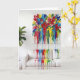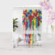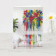 Floral abstract artwork on a white wall, with dripping paint on a white sofa in a contemporary room.