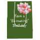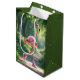 A flamingo wearing pink sneakers and headphones strolls confidently down a sunlit park path, surrounded by lush greenery and blooming flowers.
